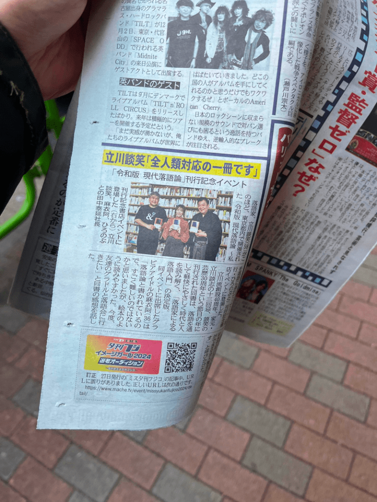 ひろのぶと株式会社から2023年10月31日に刊行された立川談笑『令和版 現代落語論 〜私を落語に連れてって〜』の記者発表会の様子が、11/28(火)付の夕刊フジ 本紙に取り上げられました。
