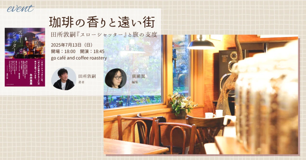 投稿日: 2025年7月13日2026年1月24日 投稿者: 廣瀬 翼田所敦嗣『スローシャッター』トークイベントを開催しました 『スローシャッター』(ひろのぶと株式会社、2023年)の著者・田所敦嗣さんと2人で、会場は三鷹の「 go café and coffee roastery」で開催しました。 少人数でコーヒーを楽しみながらおしゃべりして交流する会となりました。 開催の経緯や概要は、こちらの開催前の参加者募集noteをご参照ください。 シェア X で共有 (新しいウィンドウで開きます) X Facebook で共有 (新しいウィンドウで開きます) Facebook 友達にメールでリンクを送信 (新しいウィンドウで開きます) メールアドレス 関連